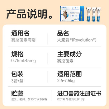 宠物健康---宠物医药器械---宠物驱虫---猫驱虫大宠爱(Revolution)0.75ml:45mg(赛拉菌素)/管