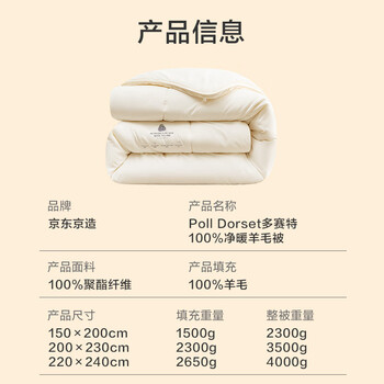 京东京造进口100%多赛特羊毛深睡被 冬厚被芯A类-冬被2.2x2.4m约8斤