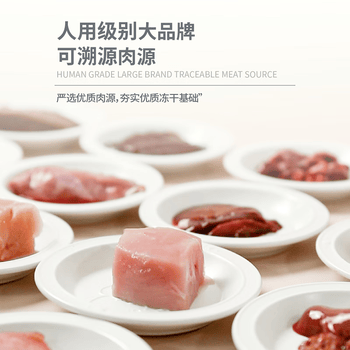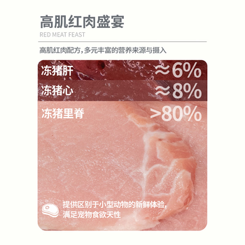 冻猪肉(里脊肉)(80%)、冻猪心(8%)、冻猪肝(6%)、鱼油(三文鱼油)、蛋粉、贻贝、豌豆纤维