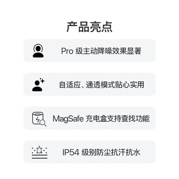 AirPods Pro2;自带扬声器和挂绳孔的 MagSafe 充电盒 (USB-C);硅胶耳塞 (四种尺寸:XS、S、M、L);USB-C 充电线;资料