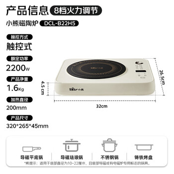 小熊(Bear)家用电磁炉电池炉2200W大功率猛火爆炒炒菜智能触控防水面板8档火力纤薄电磁灶火锅炉DCL-B22H5