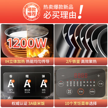 九阳(Joyoung)家用4L3~4人电饭煲电饭锅2斤铁釜内胆1200W IH立体大火3A级好米饭触控大屏40T39