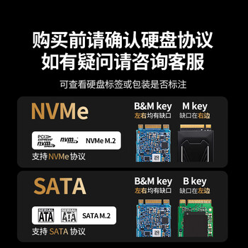 M.2双协议硬盘盒*1,Type-C数据线*1,导热硅胶条*1,硅胶套*1,螺丝刀*1,固定扣*1,说明书*1,保修卡*1,包装盒*1