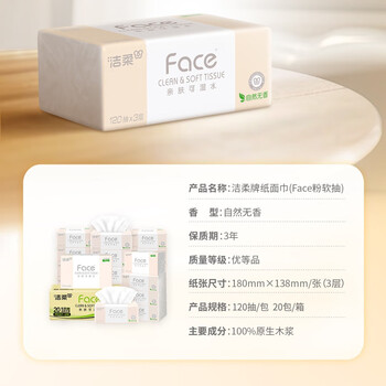 洁柔抽纸 粉Face柔韧3层120抽*20包 可湿水面巾纸 100%原生木浆 整箱(新老品交替发货)