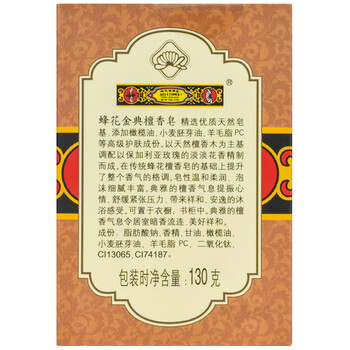 品牌: 蜂花 产品规格: 130g 保质期: 3年 产品成分:脂肪酸钠、香精、甘油、橄榄油、小麦胚芽油、羊毛脂PC、二氧化钛等 产地: 中国
