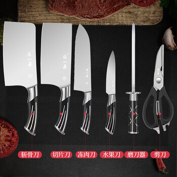切片刀x1,斩骨刀x1,冻肉刀x1,水果刀x1,厨房剪x1,磨刀棒x1,刀架x1