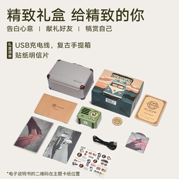 收音机×1,包装盒×1,手提袋×1,USB充电线×1,说明书×1,明信片×2,信封×1,贴纸×1,折页册×2