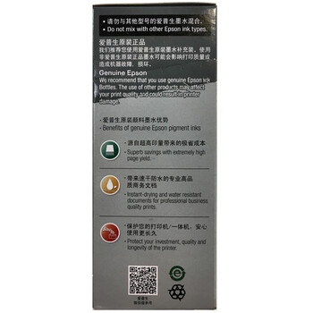 [注]打印量基于爱普生的评价方法使用ISO/IEC 24712提供的文本和图像混合测试样张得出。在无需对打印机初始化充墨的使用状态下,使用普通纸在标准质量下测试,黑色墨瓶的测试打印量约为6000页,若用户使用普通纸在标准质量下每月打印与以上样张相同覆盖率的黑色文本500页,则一年不用换墨水。