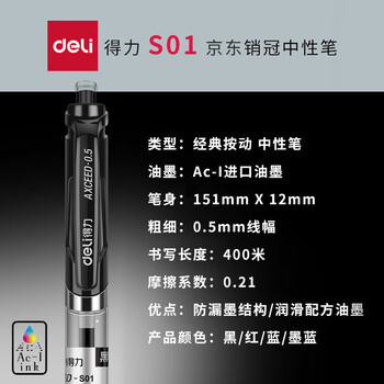 得力(deli)S01中性笔签字笔 0.5mm子弹头经典办公按动笔水笔 黑色 30支/盒 33489