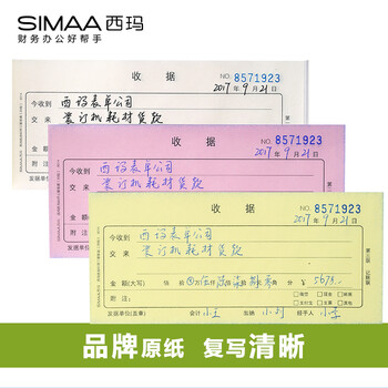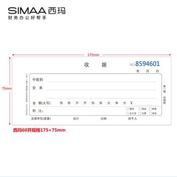 西玛(SIMAA)10本装60k收据 三联单栏财务手写收据单175*75mm无碳复写自带垫板单本连号设计办公用品8014