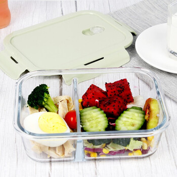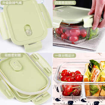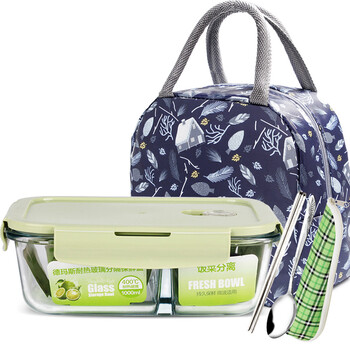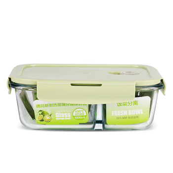 德玛斯耐热玻璃保鲜盒 微波炉饭盒上班族便当盒 北欧绿隔1000ml+包+餐具
