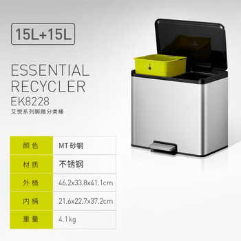 EKO分类脚踏垃圾桶15L+15L砂钢双桶不锈钢大号带盖张若昀推荐8228