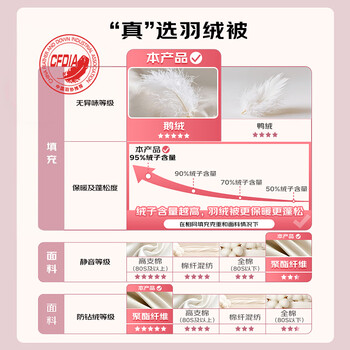 水星家纺羽绒被95%白鹅绒被子冬季加厚冬被芯双人羽绒被220cm×240cm1200g