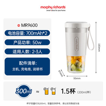 摩飞电器(Morphyrichards)榨汁机现榨鲜喝 便携式榨汁杯 磁吸充电大容量电池迷你无线果汁机 料理机小体重随行杯 MR9600白色