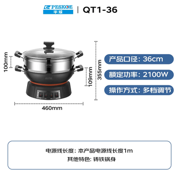 半球(Peskoe)电蒸锅多用途锅电热锅 36CM电炒锅多用途锅 加厚铸铁锅身电煮锅QT1-36 带蒸笼