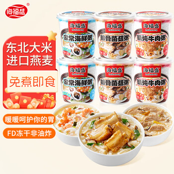 海福盛速食粥懒人早餐宵夜营养粥八宝粥冻干粥海鲜排骨牛肉粥3味6杯228g