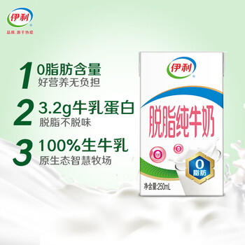 伊利【新鲜日期】脱脂纯牛奶 250ml*24盒 脱脂好营养 礼盒装