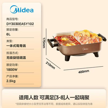 美的(Midea)电火锅 鸳鸯锅 火锅专用锅 电煮锅煎烤涮肉一体锅 多功能锅6L火锅锅 DY3030Easy102