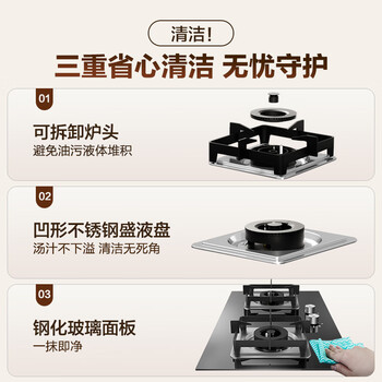 燃气灶:主机*1 锅支架*2 说明书*1 卡箍*2 友情提示卡*1 电池*1 开孔样板*1 防水密封条*2