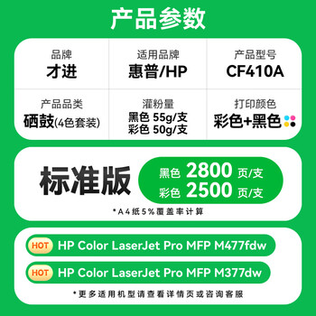 才进适用惠普m477fdw硒鼓彩色m377dw m452dw/nw/dn墨盒cf410a粉盒477dw/dn/fnw打印机Color LaserJet Pro MFP