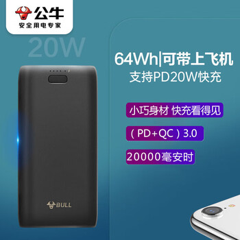 公牛[3C认证] 20000毫安时充电宝PD20W 兼容18W 快充移动电源 适用于苹果/华为/小米/安卓等 可上飞机