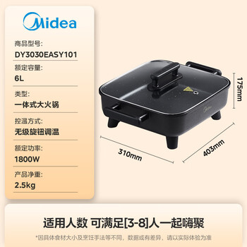 美的(Midea)电火锅 电炒锅家用多功能电锅煎烤涮一体电热电煮锅6L 火锅锅不粘烤鱼锅MC-DY3030Easy101