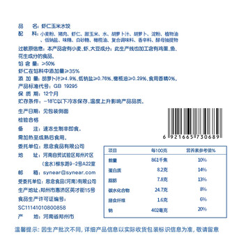 思念儿童成长营养系列虾仁玉米水饺300g*1盒