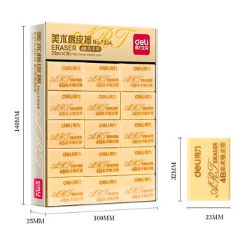 得力(deli)橡皮擦7534 绘画4B黄色美术绘图考试橡皮不留痕无碎屑学生文具学习用品象皮檫30块装