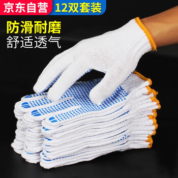 趣行 劳保点胶手套加厚耐磨 通用白线手套防护手套 高密度工地工作手套 劳防用品 12双装