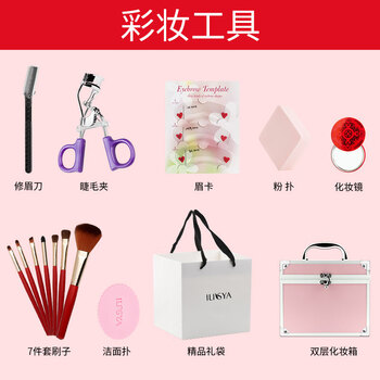 水散粉*1+腮红*1+遮瑕膏*1+眼影*1+眉笔*1+睫毛膏*1+眼线液笔*1+口红*1+化妆箱*1+化妆刷*7+粉扑*1+吸油纸*1+洁面扑*1+修眉刀*1+睫毛夹*1+化妆镜*1