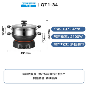 半球(Peskoe)电蒸锅多用途锅电热锅 34CM电炒锅电锅 铸铁锅身电煮锅QT1-34 带蒸笼