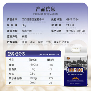 KOKO 口口牌泰国茉莉香米5KG× 1袋