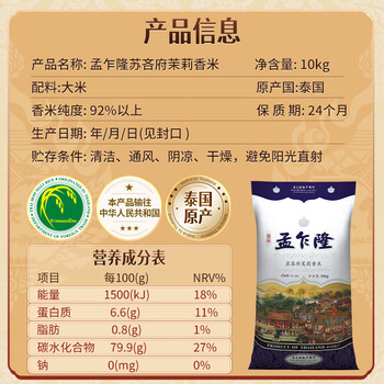 孟乍隆 苏吝茉莉香米10KG×1袋