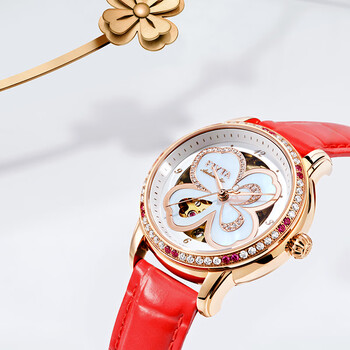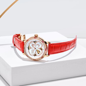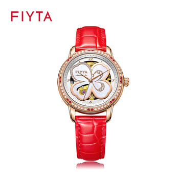 飞亚达(FIYTA)手表女 四叶草机械表镂空贝母表盘红皮带 节日生日礼物送老婆