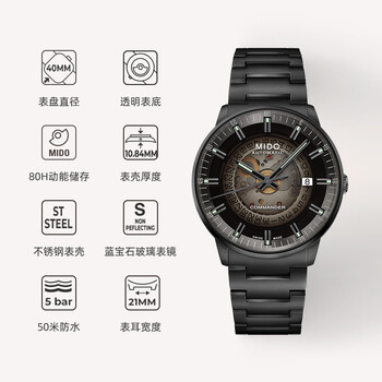 美度(MIDO)瑞士手表 指挥官 幻影款 商务休闲 黑钢 机械钢带男表送男友