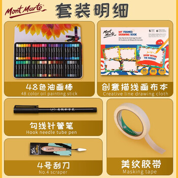 蒙玛特油画棒48色*1 蒙玛特创意描线画布本25x30cm*1 直径1.5CM美纹胶带(14米)*1 勾线针管笔*1 蒙玛特调色刀4号*1