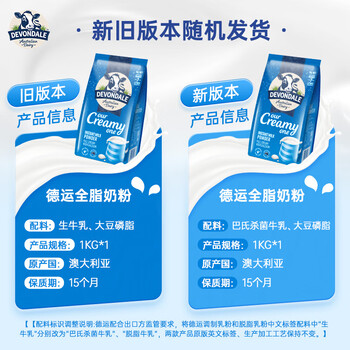 德运(Devondale)全脂成人奶粉1kg袋装调制乳粉儿童学生奶粉高钙澳洲原装进口早餐