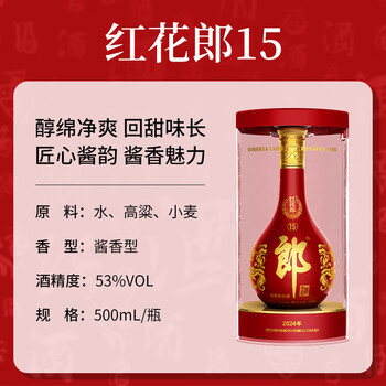 郎酒 红花郎15 酱香型白酒 53度 500mL*6瓶 整箱装