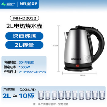 美菱(MeiLing)烧水壶热水壶电热水壶 304不锈钢电水壶 烧开自动断电 2L大容量 MH-D2032银色