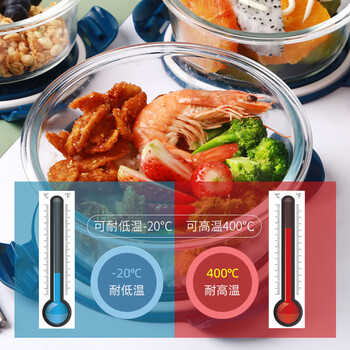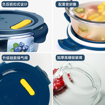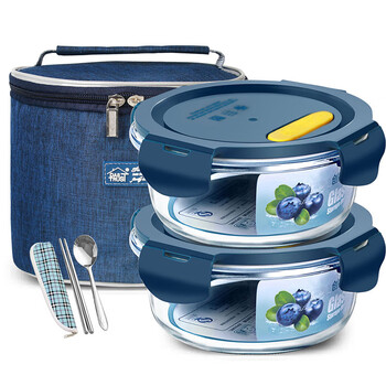 创得耐热玻璃保鲜盒微波炉饭盒上班族便当盒星海蓝圆1000ml*2+包+餐具