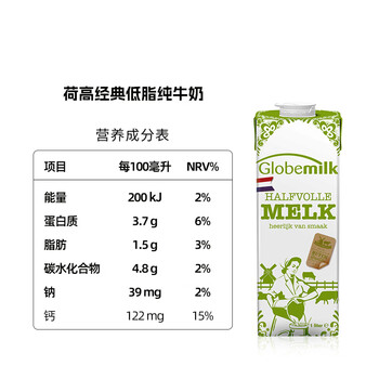 荷高(Globemilk)部分脱脂纯牛奶1L*6 荷兰原装进口 低脂高钙