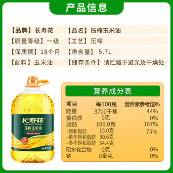 长寿花 压榨玉米油5.7L 食用油 非转基因 压榨一级(新老包装随机发货)