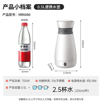 摩飞电器(Morphyrichards)电水壶电热水壶 0.5L旅行便携式烧水壶316不锈钢随行冲奶泡茶办公室养生保温杯电热水杯MR6080