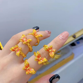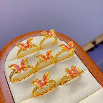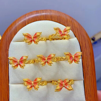 Lossot足金999蝴蝶黄金戒指女5D硬金素圈珐琅戒指送女友老婆生日礼物