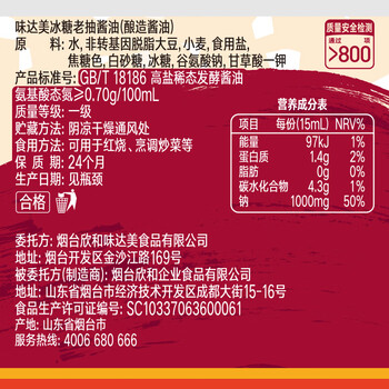 味达美经典系列冰糖老抽酱油1L【酿造酱油】调味料欣和出品