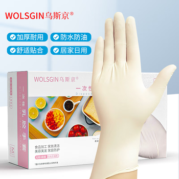 乌斯京(WOLSGIN)一次性手套 乳胶手套100只M中号 橡胶食品级餐饮加厚高弹检查手套