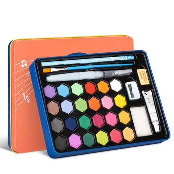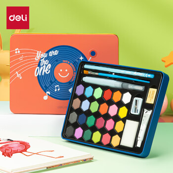 得力(deli)固体水彩24色水彩颜料套装含画笔自来水笔绘画彩绘铁盒装学生涂鸦女孩儿童礼物