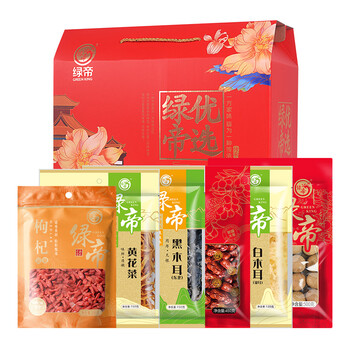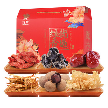 绿帝新疆贡枣450g*1 绿帝5A桂圆王500g*1 绿帝黄花菜150g*1 绿帝白木耳120g*1 绿帝贡果枸杞200g*1 绿帝黑木耳150g*1 绿帝礼盒*1