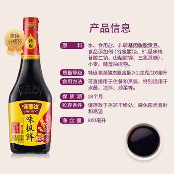 味事达 味极鲜系列 生抽酱油800ml【特级酱油】点蘸凉拌酿造酱油