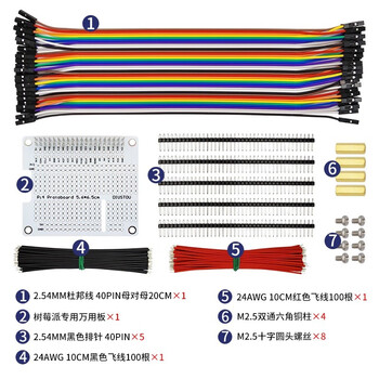 1.树莓派专用万用板*1块; 2.母对母杜邦线40PIN*1排; 3.红色24AWG 10cm飞线*100根; 4.黑色24AWG 10cm飞线*100根; 5.配套铜柱、螺丝若干